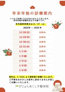 05-06schedule 2025年12月24日 WRITER ぴじょんあくしす 整体院 この記事を書いている人 - WRITER - ぴじょんあくしす 整体院 この記事を書いている人 - WRITER - ぴじょんあくしす 整体院 関連記事 - Related Posts - 高気圧酸素カプセル 初期モデルから使用 10年以上の導入実績 『フォームローラー』は私の専属整体師です! 来院効果を高めたい方必見の動画です! 【北海道から福島へ】気がかりだった外出ができました! 最新記事 - New Posts - 新年のごあいさつと、2026年からの診療体制について 年末年始の診療時間のお知らせ 「note」へお役立ち情報を投稿中です 予約システム好評稼働中!